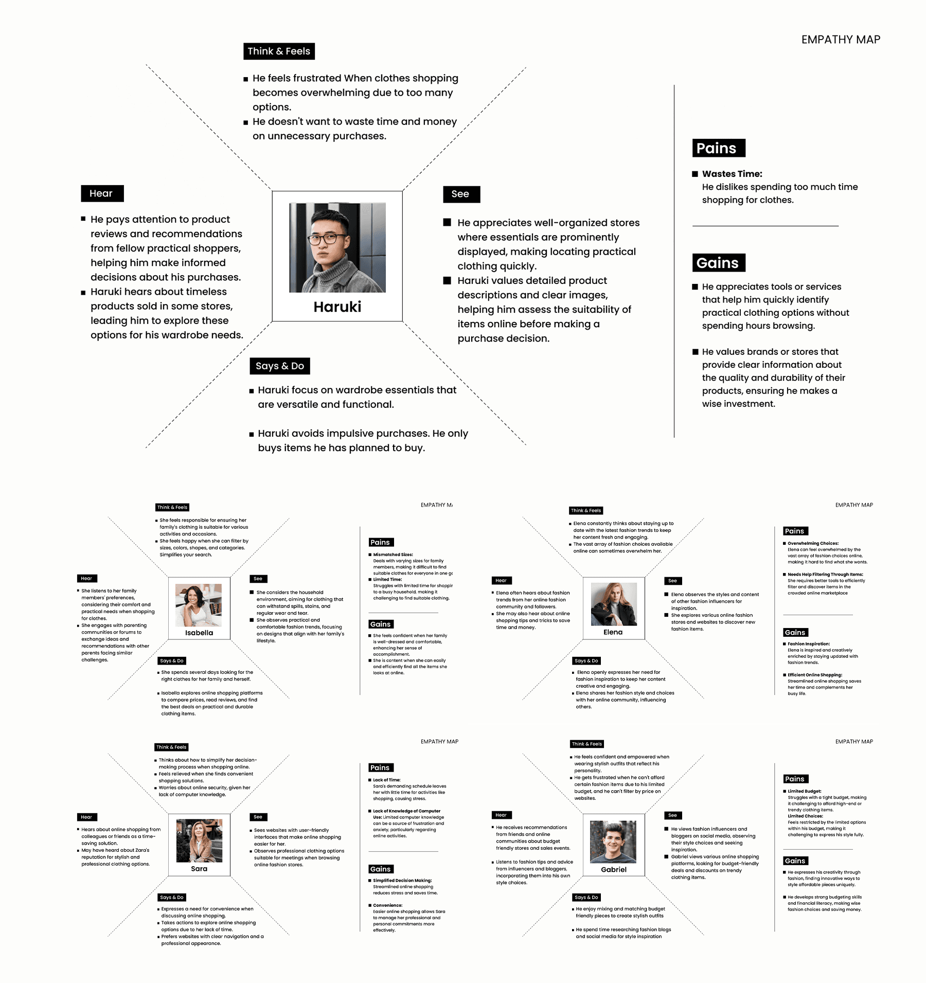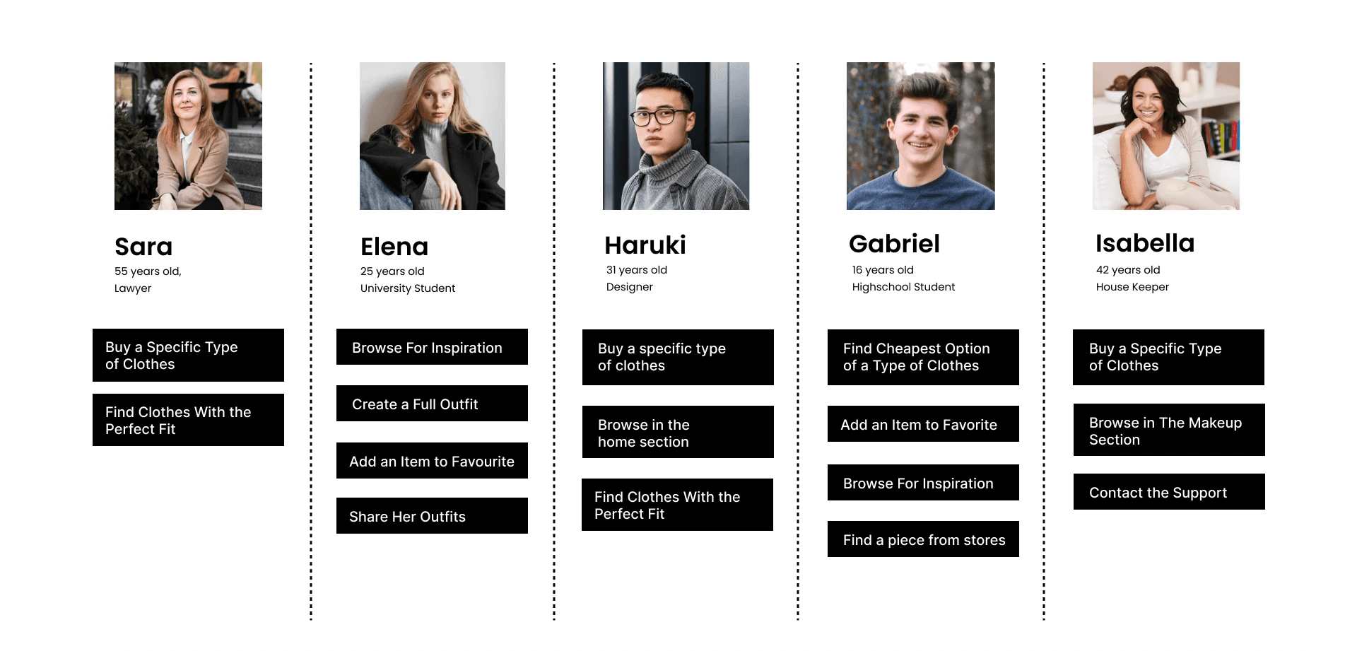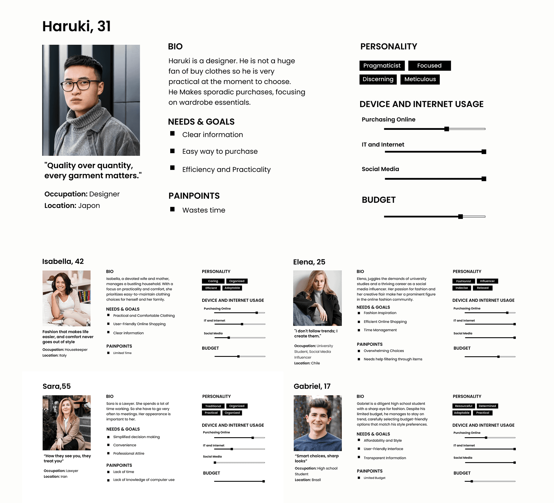 After doing research on types of users and their habits, Personas were created to better understand and empathize with our users. The goal was to be as diverse and inclusive as possible, to account for very different types of usage and motivation. This way we can also have a more didactic approach to our presentation.