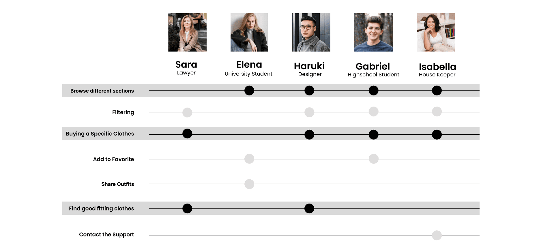 From the previous steps we could clearly understand the types of tasks different users would want to perform in Zara's website, and using a Task Matrix we were able to define the most important ones to be focused by our team.