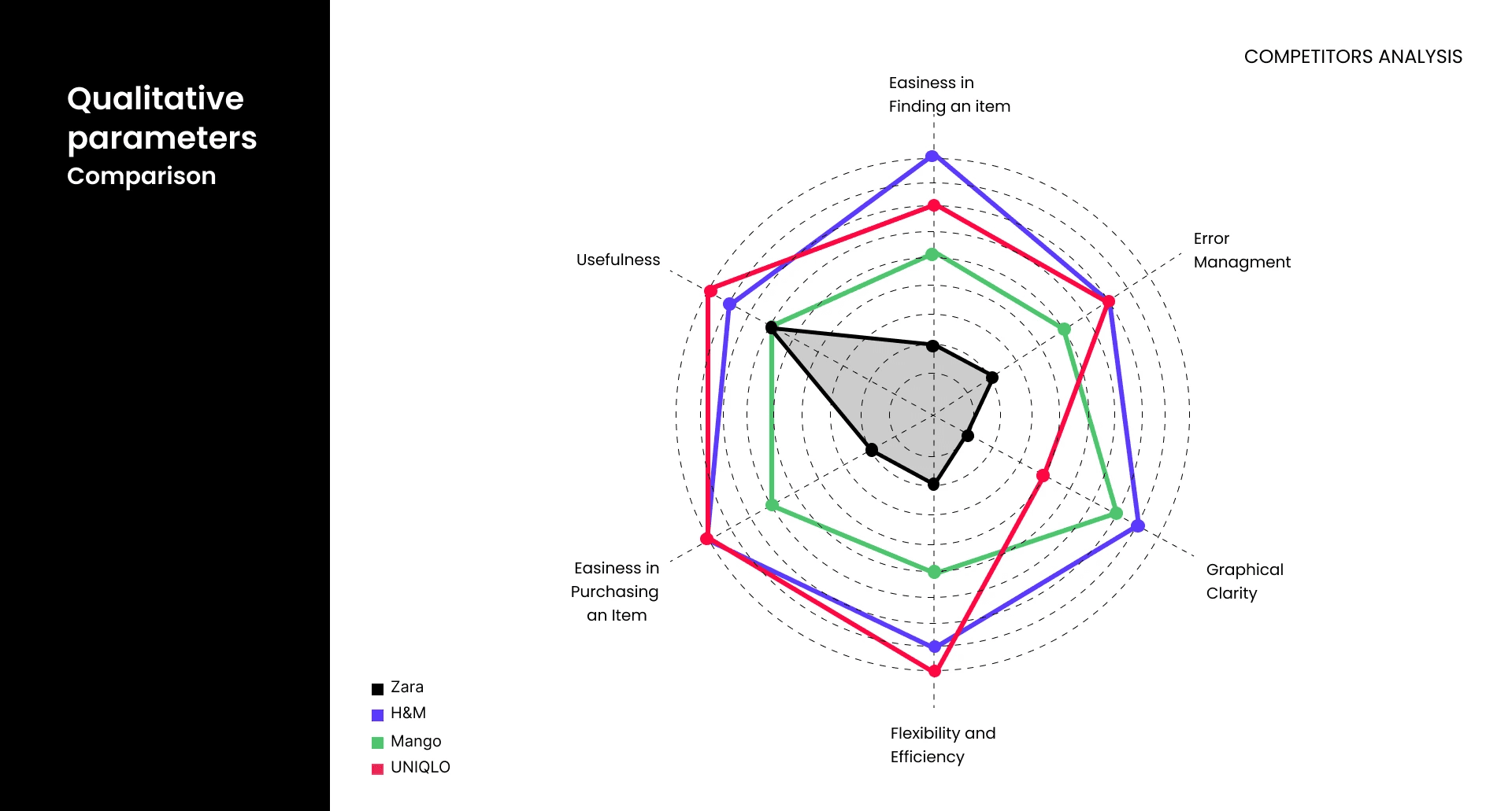 After the walkthrough, organizing the extensive data gathered was much needed. Our analysis generated both Qualitative and Quantitative results, that helped guide us to more efficient solutions. We understood which qualitative parameters were relevant for the archetype, that we should keep in mind for the redesign, and compared Zara's Performance with the Benchmarks.